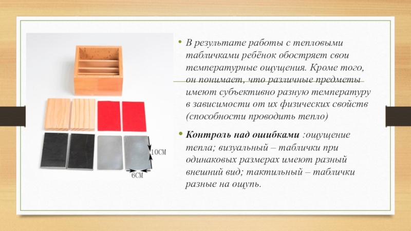 Контроль над ошибками :ощущение тепла; визуальный – таблички при одинаковых размерах имеют разный внешний вид; тактильный – таблички разные на ощупь.