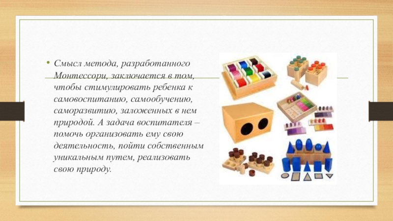 Смысл метода, разработанного Монтессори, заключается в том, чтобы стимулировать