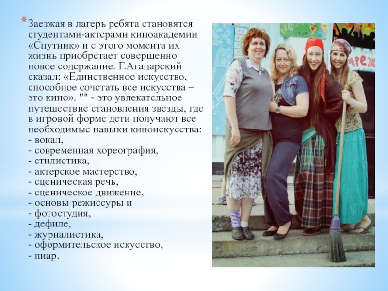 Слайд 28Заезжая в лагерь ребята становятся студентами-актерами киноакадемии «Спутник» и с