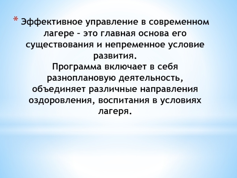 Слайд 32Эффективное управление в современном лагере – это главная основа его