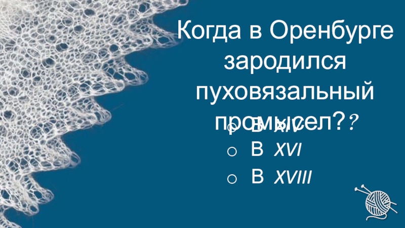 В XVIIIВ XVIВ XIVКогда в Оренбурге зародился пуховязальный промысел??