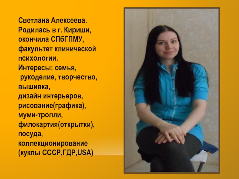 Светлана Алексеева.Родилась в г. Кириши, окончила СПбГПМУ, факультет клинической психологии.Интересы: семья, рукоделие, творчество, вышивка, дизайн интерьеров, рисование(графика),муми-тролли,филокартия(открытки), посуда, коллекционирование(куклы СССР,ГДР,USA)