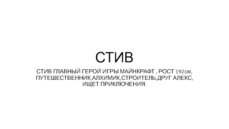 СТИВСТИВ ГЛАВНЫЙ ГЕРОЙ ИГРЫ МАЙНКРАФТ , РОСТ 192см,ПУТЕШЕСТВЕННИК,АЛХИМИК,СТРОИТЕЛЬ,ДРУГ АЛЕКС, ИЩЕТ ПРИКЛЮЧЕНИЯ.