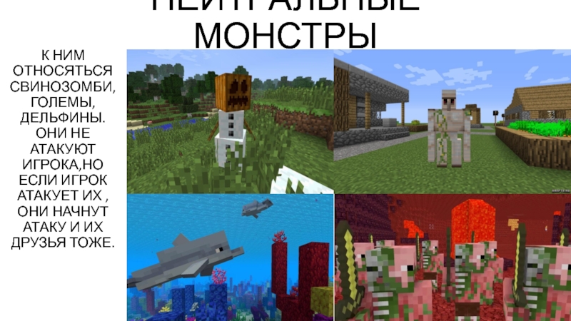 НЕЙТРАЛЬНЫЕ МОНСТРЫК НИМ ОТНОСЯТЬСЯ СВИНОЗОМБИ,ГОЛЕМЫ,ДЕЛЬФИНЫ. ОНИ НЕ АТАКУЮТ ИГРОКА,НО ЕСЛИ ИГРОК АТАКУЕТ ИХ , ОНИ НАЧНУТ АТАКУ