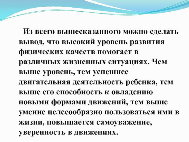 успешнее двигательная деятельность ребенка, тем выше его способность к овладению новыми формами движений, тем выше умение целесообразно пользоваться ими в жизни, повышается самоуважение, уверенность в движениях.