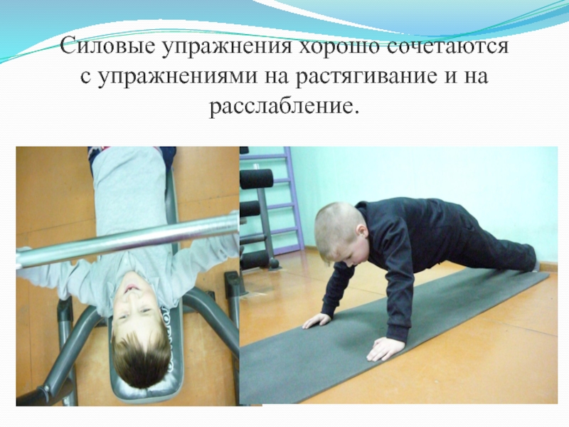 Слайд 30Силовые упражнения хорошо сочетаются с упражнениями на растягивание и на расслабление.