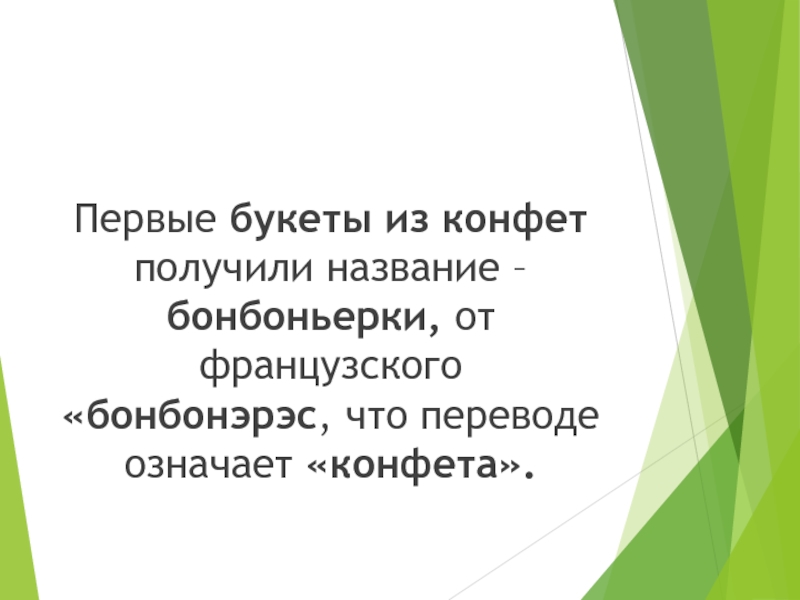 Слайд 11Первые букеты из конфет получили название – бонбоньерки, от французского