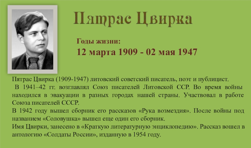 Союз писателей Литовской ССР. Во время войны находился в эвакуации в разных городах нашей страны. Участвовал в работе Союза писателей СССР.В 1942 году вышел сборник его рассказов «Рука возмездия». После войны под названием «Соловушка» вышел еще один его сборник.