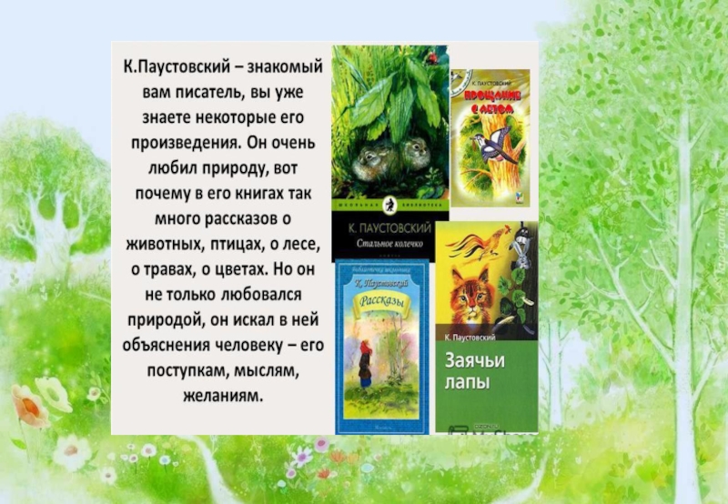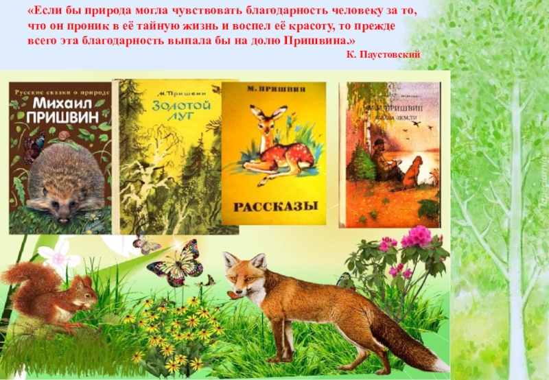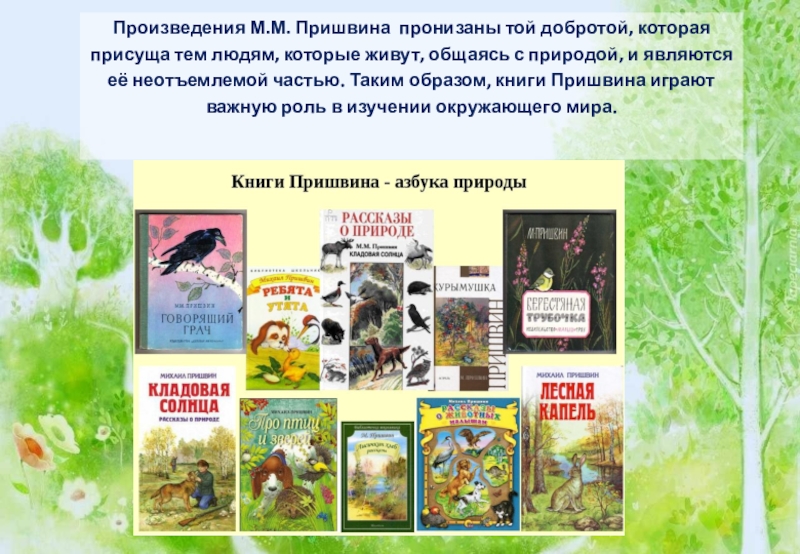 В произведениях М.М. Пришвина мы постоянно встречаемся с мыслью о необходимости бережного отношения к природе, вреде бездумной ее эксплуатации, о ее нравственной ценности, способности облагораживающее действовать на душу человека, формировать его нравственный мир.