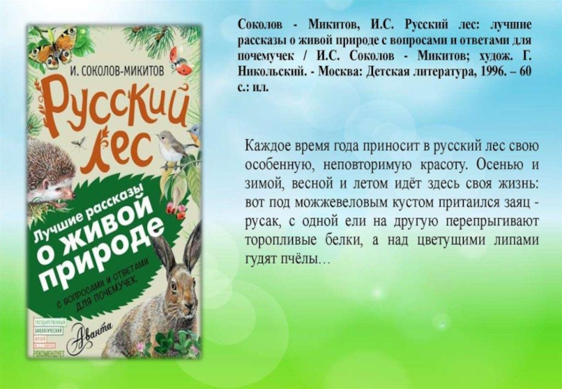 Рассказы замечательного русского писателя и ученого о природе, о птицах и зверях, об их жизни на воле и рядом с человеком.