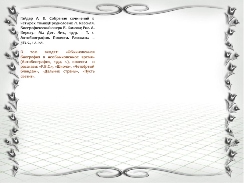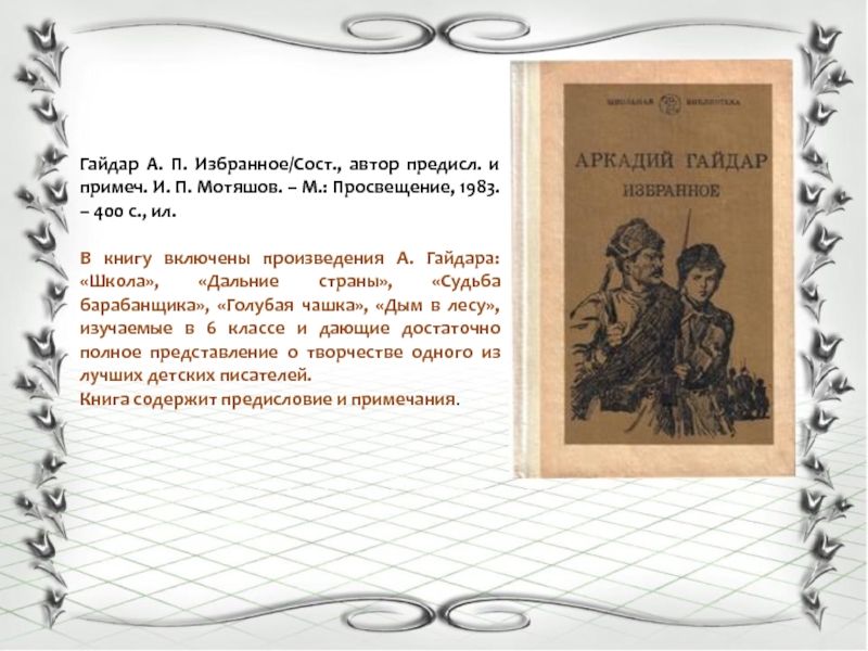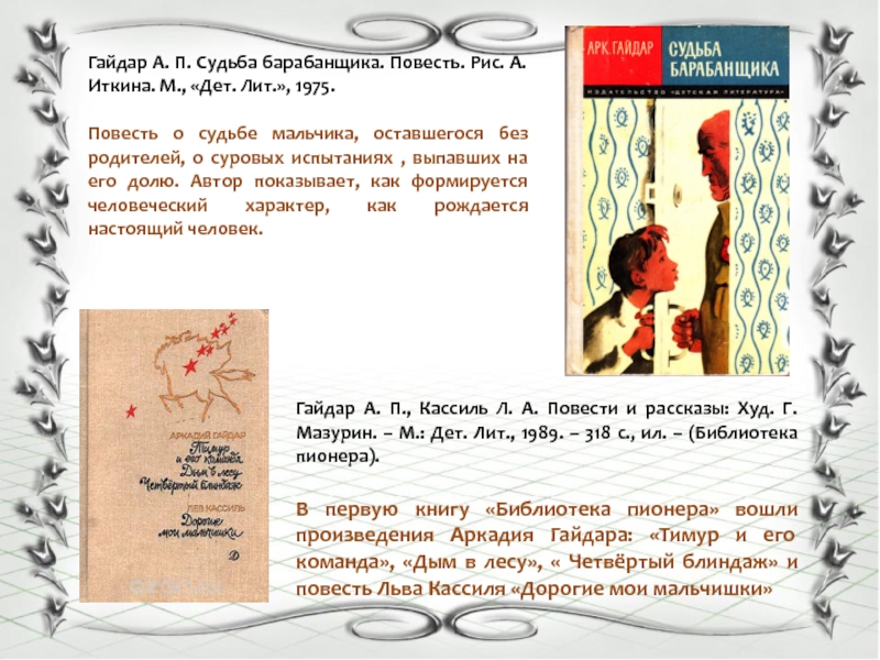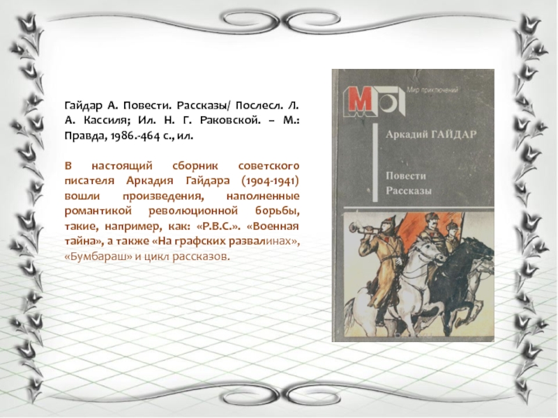 Гайдар А. П., Кассиль Л. А. Повести и рассказы: Худ. Г. Мазурин. – М.: Дет. Лит., 1989. – 318 с., ил. – (Библиотека пионера).