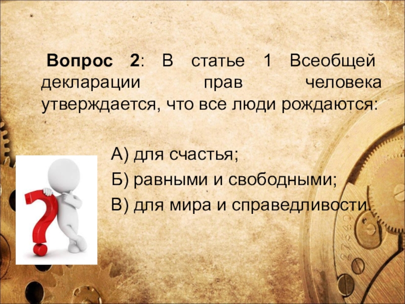 Слайд 6 Вопрос 2: В статье 1 Всеобщей декларации прав человека утверждается,