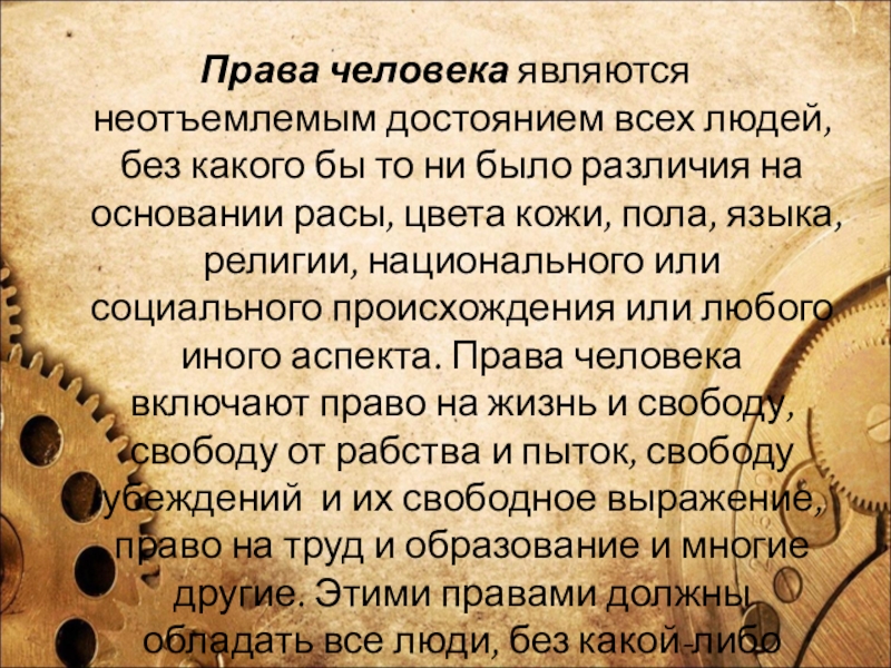 языка, религии, национального или социального происхождения или любого иного аспекта. Права человека включают право на жизнь и свободу, свободу от рабства и пыток, свободу убеждений  и их свободное выражение, право на труд и образование и многие другие. Этими правами должны обладать все люди, без какой-либо дискриминации.