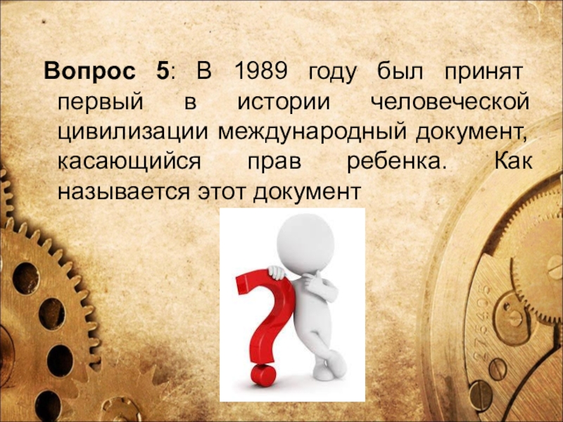 Вопрос 5: В 1989 году был принят первый в истории человеческой цивилизации международный документ, касающийся прав ребенка.