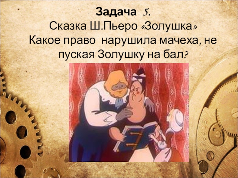 Слайд 23Задача 5. Сказка Ш.Пьеро «Золушка» Какое право нарушила мачеха, не пуская