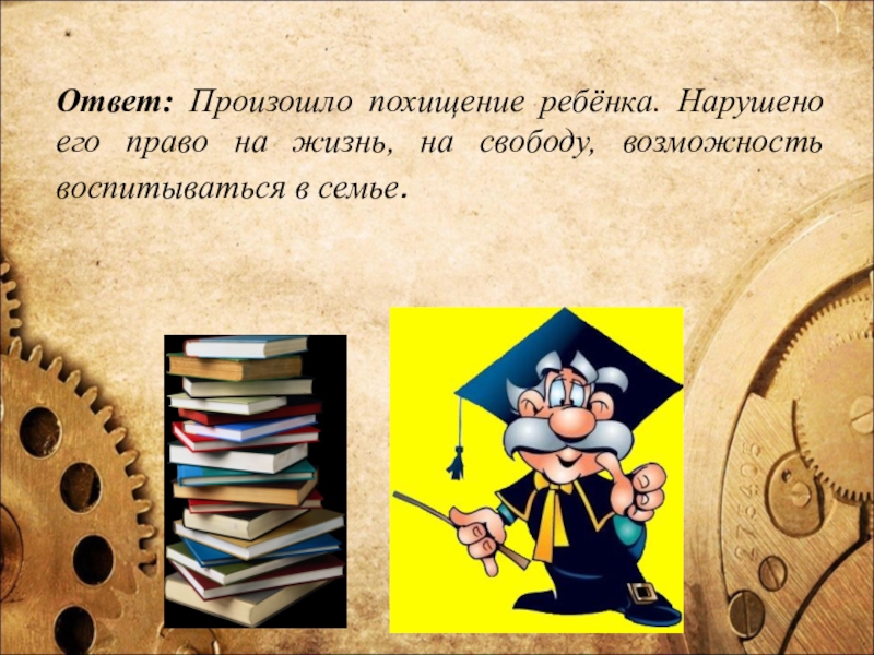 Слайд 16Ответ: Произошло похищение ребёнка. Нарушено его право на жизнь, на