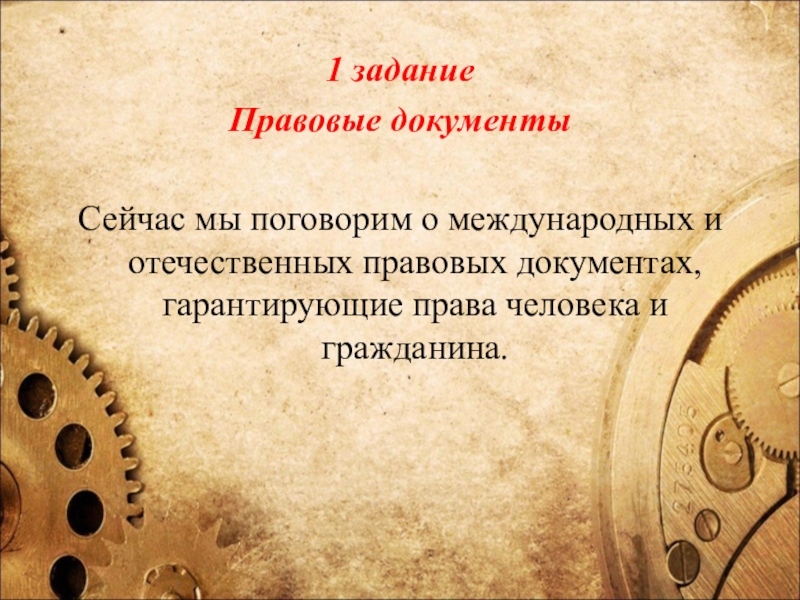 1 задание Правовые документыСейчас мы поговорим о международных и отечественных правовых документах, гарантирующие права человека и гражданина.
