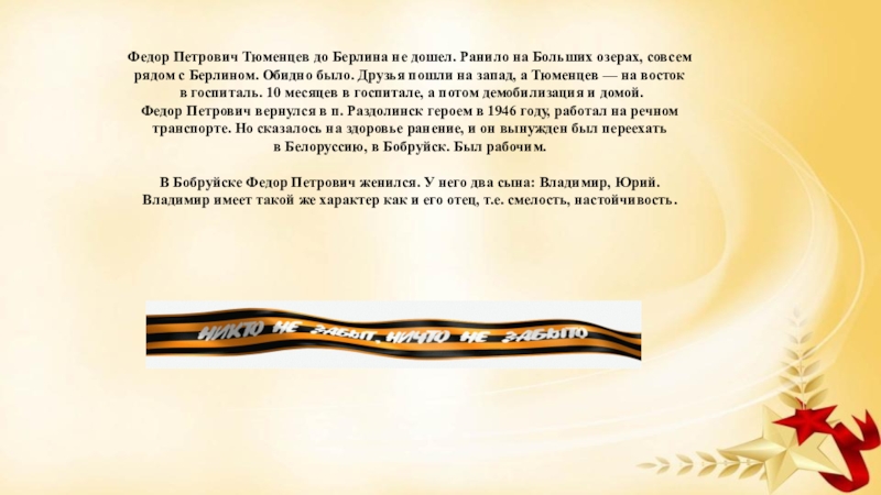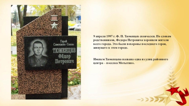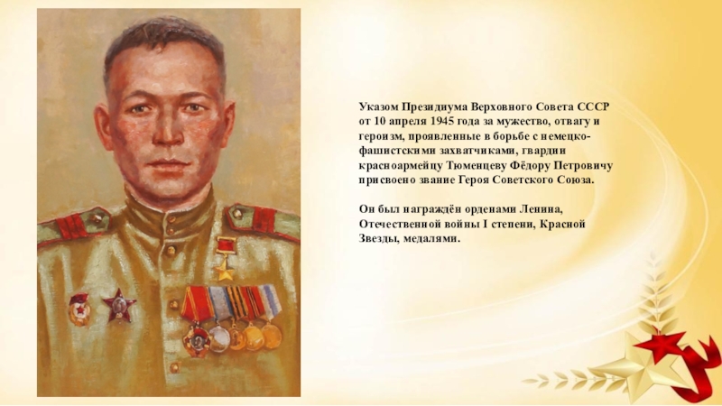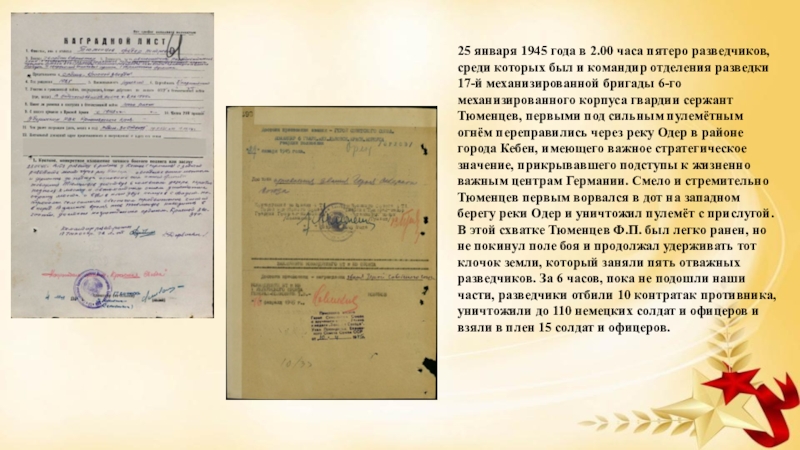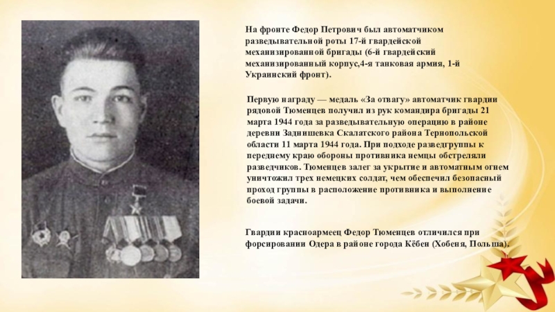 Гвардии красноармеец Федор Тюменцев отличился при форсировании Одера в районе города Кёбен (Хобеня, Польша).