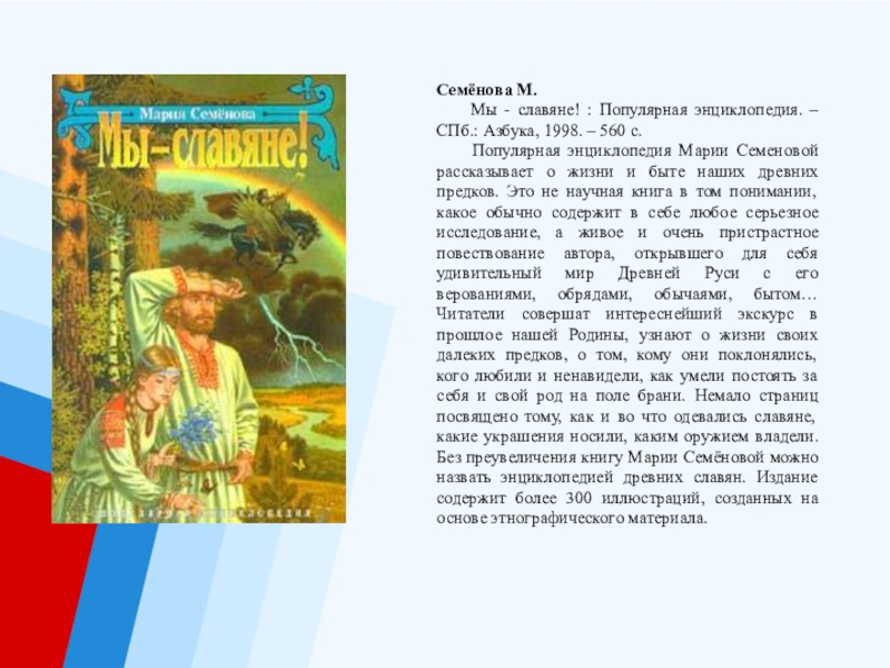 энциклопедия Марии Семеновой рассказывает о жизни и быте наших древних предков. Это не научная книга в том понимании, какое обычно содержит в себе любое серьезное исследование, а живое и очень пристрастное повествование автора, открывшего для себя удивительный мир Древней Руси с его верованиями, обрядами, обычаями, бытом… Читатели совершат интереснейший экскурс в прошлое нашей Родины, узнают о жизни своих далеких предков, о том, кому они поклонялись, кого любили и ненавидели, как умели постоять за себя и свой род на поле брани. Немало страниц посвящено тому, как и во что одевались славяне, какие украшения носили, каким оружием владели. Без преувеличения книгу Марии Семёновой можно назвать энциклопедией древних славян. Издание содержит более 300 иллюстраций, созданных на основе этнографического материала.