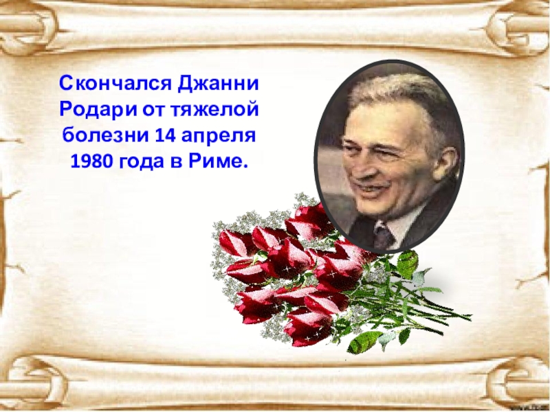 Слайд 23Скончался Джанни Родари от тяжелой болезни 14 апреля 1980 года