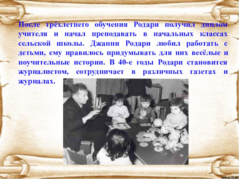 Слайд 7После трёхлетнего обучения Родари получил диплом учителя и начал преподавать