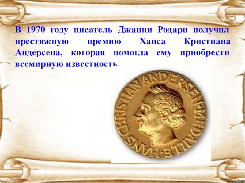 Слайд 19В 1970 году писатель Джанни Родари получил престижную премию Ханса