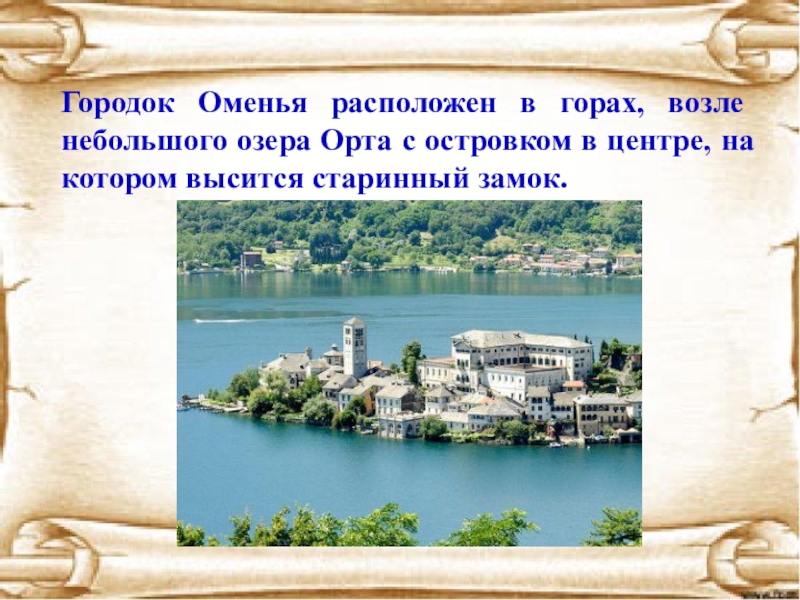 Слайд 4Городок Оменья расположен в горах, возле небольшого озера Орта с