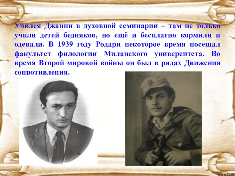 1939 году Родари некоторое время посещал факультет филологии Миланского университета. Во время Второй мировой войны он был в рядах Движения сопротивления.