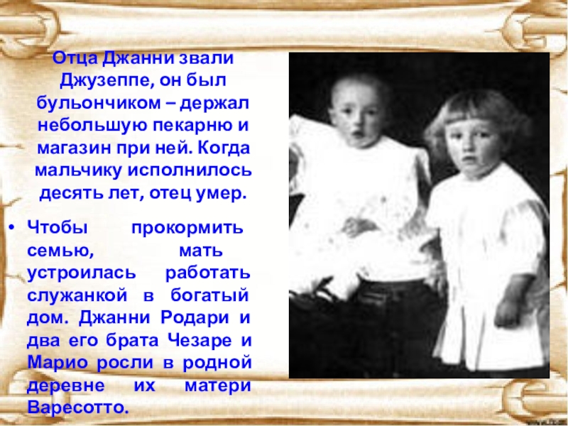 Чтобы прокормить семью, мать устроилась работать служанкой в богатый дом. Джанни Родари и два его брата Чезаре и Марио росли в родной деревне их матери Варесотто.