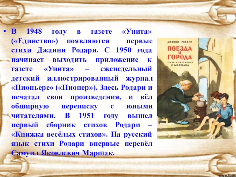 «Унита» – еженедельный детский иллюстрированный журнал «Пионьере» («Пионер»). Здесь Родари и печатал свои произведения, и вёл обширную переписку с юными читателями. В 1951 году вышел первый сборник стихов Родари – «Книжка весёлых стихов». На русский язык стихи Родари впервые перевёл Самуил Яковлевич Маршак.