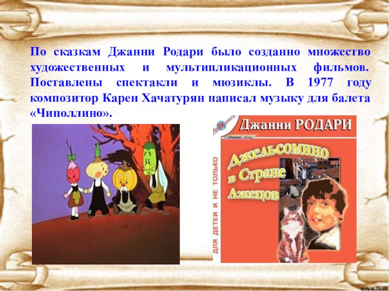 Слайд 20По сказкам Джанни Родари было созданно множество художественных и мультипликационных