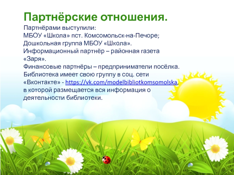 свою группу в соц. сети «Вконтакте» - https://vk.com/modelbibliotkomsomolska, в которой размещается вся информация о деятельности библиотеки.