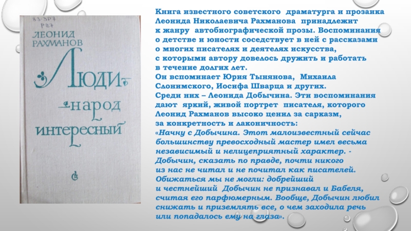 Слайд 22Книга известного советского драматурга и прозаика Леонида Николаевича Рахманова принадлежит