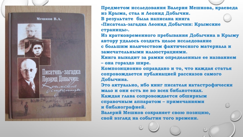 Слайд 14Предметом исследования Валерия Мешкова, краеведа из Крыма, стал и Леонид