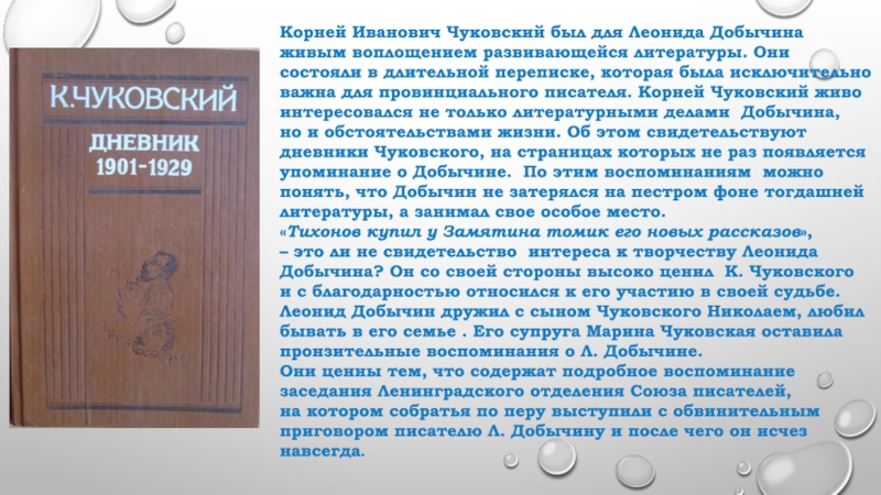 Слайд 18Корней Иванович Чуковский был для Леонида Добычина живым воплощением развивающейся