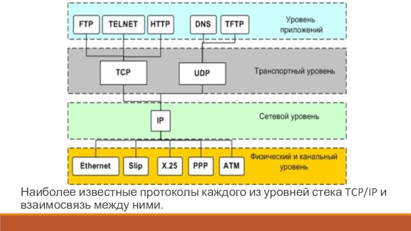 Слайд 41Наиболее известные протоколы каждого из уровней стека TCP/IP и взаимосвязь