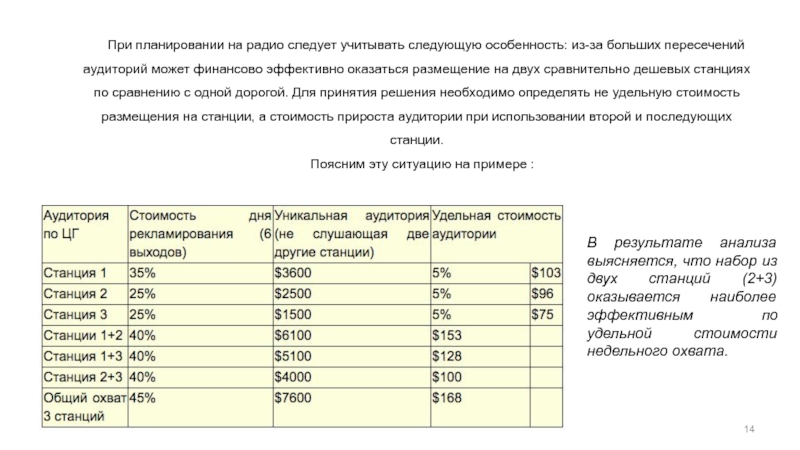 на двух сравнительно дешевых станциях по сравнению с одной дорогой. Для принятия решения необходимо определять не удельную стоимость размещения на станции, а стоимость прироста аудитории при использовании второй и последующих станции.