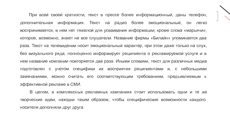 он легко воспринимается, в нем нет тяжелой для усваивания информации, кроме слова «марьячи», которое, возможно, знают не все слушатели. Название фирмы «Билайн» упоминается два раза. Текст на телевидении носит эмоциональный характер, при этом даже только на слух, без визуального ряда, полноценно информирует реципиента о рекламируемой услуге и в нем название компании повторяется два раза. Иными словами, текст для различных медиа подготовлен с учетом специфики их восприятия реципиентами и, с небольшими замечаниями, можно считать его соответствующим требованиям, предъявляемым к эффективной рекламе в СМИ.