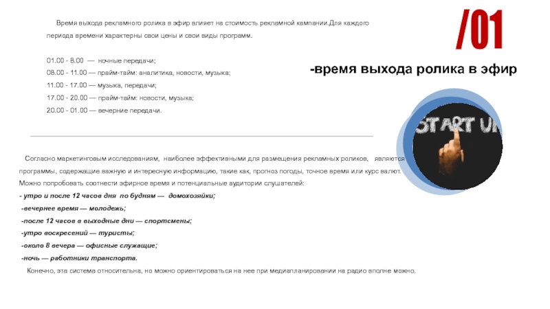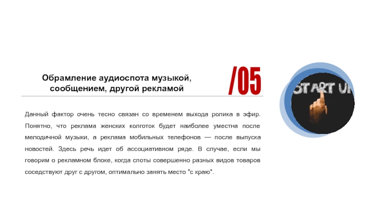 колготок будет наиболее уместна после мелодичной музыки, а реклама мобильных телефонов — после выпуска новостей. Здесь речь идет об ассоциативном ряде. В случае, если мы говорим о рекламном блоке, когда споты совершенно разных видов товаров соседствуют друг с другом, оптимально занять место "с краю".