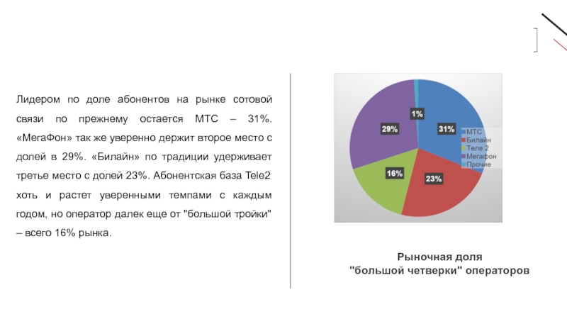 же уверенно держит второе место с долей в 29%. «Билайн» по традиции удерживает третье место с долей 23%. Абонентская база Tele2 хоть и растет уверенными темпами с каждым годом, но оператор далек еще от "большой тройки" – всего 16% рынка.