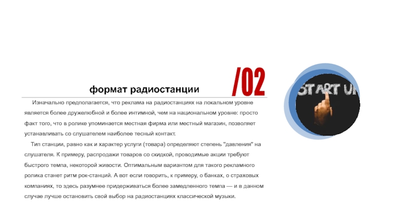 Тип станции, равно как и характер услуги (товара) определяют степень "давления" на слушателя. К примеру, распродажи товаров со скидкой, проводимые акции требуют быстрого темпа, некоторой живости. Оптимальным вариантом для такого рекламного ролика станет ритм рок-станций. А вот если говорить, к примеру, о банках, о страховых компаниях, то здесь разумнее придерживаться более замедленного темпа — и в данном случае лучше остановить свой выбор на радиостанциях классической музыки.