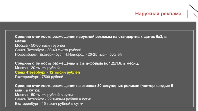 Средняя стоимость размещения наружной рекламы на стандартных щитах 6х3,