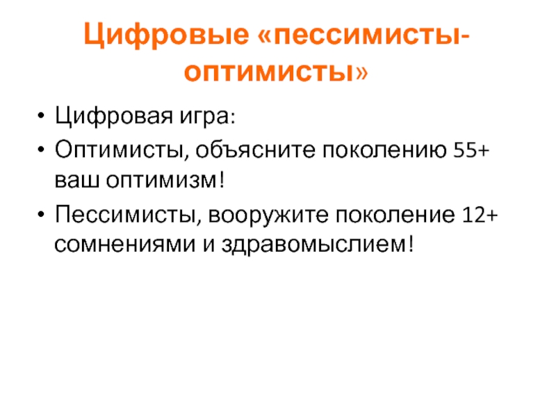 Цифровые «пессимисты-оптимисты»Цифровая игра: Оптимисты, объясните поколению 55+ ваш оптимизм!Пессимисты, вооружите поколение 12+ сомнениями и здравомыслием!