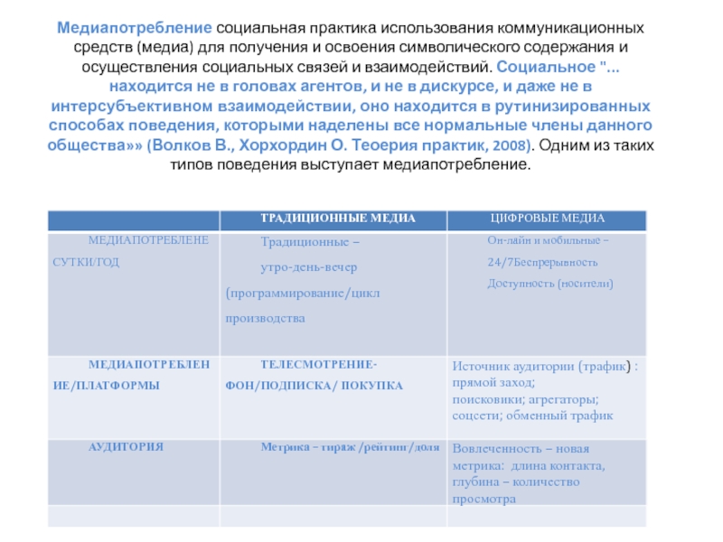 "...находится не в головах агентов, и не в дискурсе, и даже не в интерсубъективном взаимодействии, оно находится в рутинизированных способах поведения, которыми наделены все нормальные члены данного общества»» (Волков В., Хорхордин О. Теоерия практик, 2008). Одним из таких типов поведения выступает медиапотребление.
