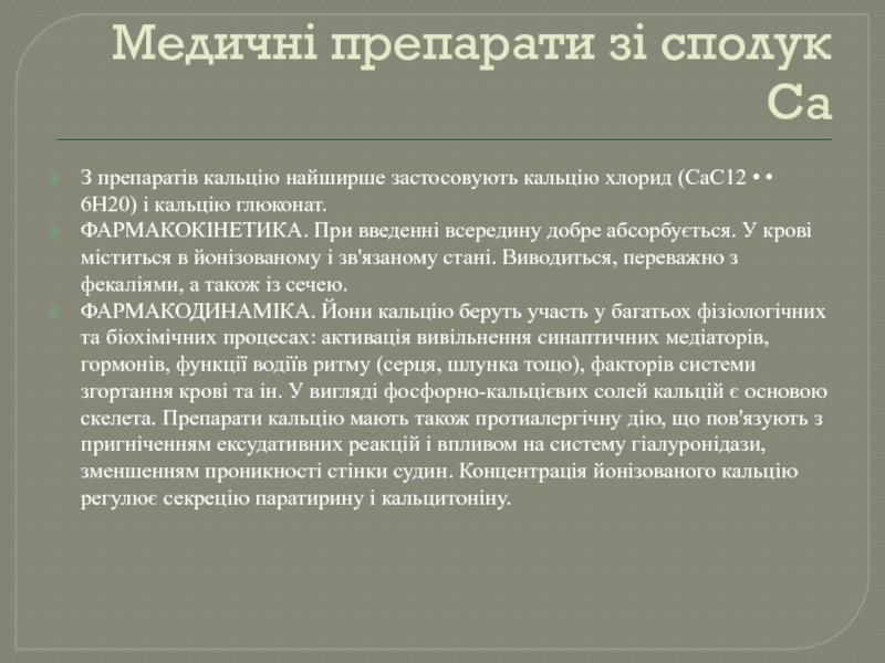 ФАРМАКОДИНАМІКА. Йони кальцію беруть участь у багатьох фізіологічних та біохімічних процесах: активація вивільнення синаптичних медіаторів, гормонів, функції водіїв ритму (серця, шлунка тощо), факторів системи згортання крові та ін. У вигляді фосфорно-кальцієвих солей кальцій є основою скелета. Препарати кальцію мають також протиалергічну дію, що пов'язують з пригніченням ексудативних реакцій і впливом на систему гіалуронідази, зменшенням проникності стінки судин. Концентрація йонізованого кальцію регулює секрецію паратирину і кальцитоніну.