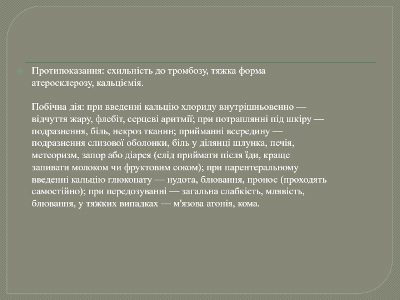 при введенні кальцію хлориду внутрішньовенно — відчуття жару, флебіт, серцеві