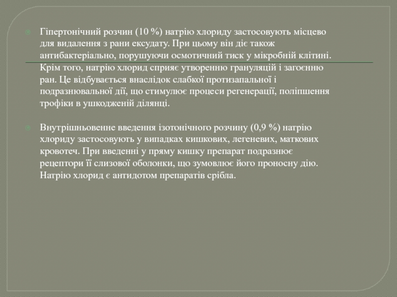 осмотичний тиск у мікробній клітині. Крім того, натрію хлорид сприяє утворенню грануляцій і загоєнню ран. Це відбувається внаслідок слабкої протизапальної і подразнювальної дії, що стимулює процеси регенерації, поліпшення трофіки в ушкодженій ділянці.