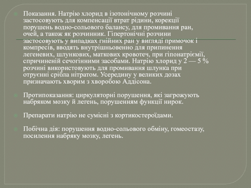 Слайд 12Показання. Натрію хлорид в ізотонічному розчині застосовують для компенсації втрат