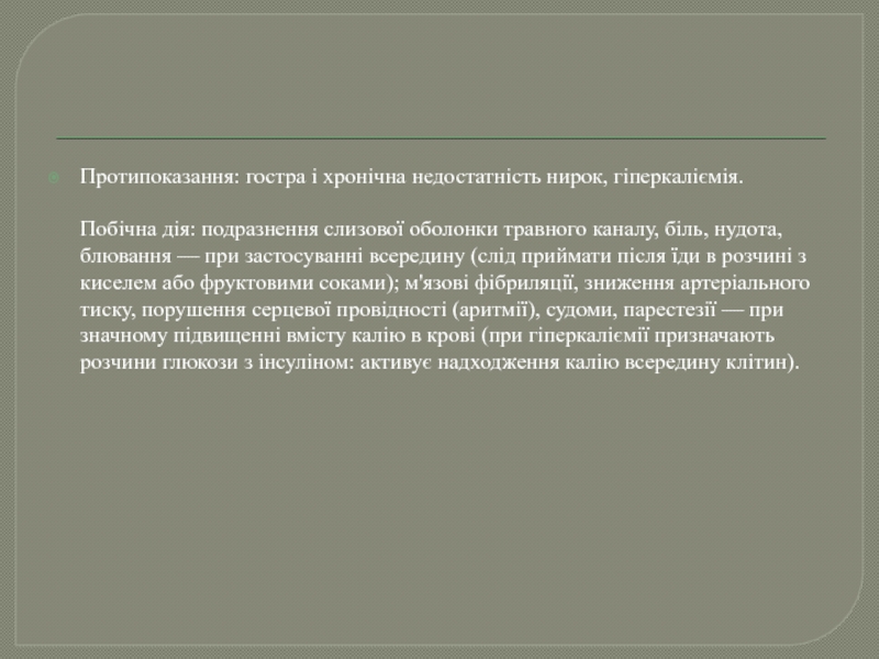 Протипоказання: гостра і хронічна недостатність нирок, гіперкаліємія.