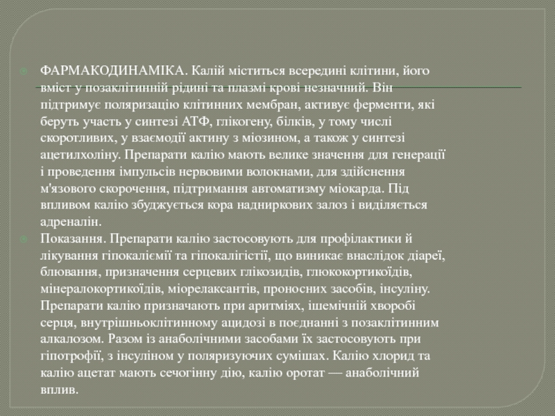 ФАРМАКОДИНАМІКА. Калій міститься всередині клітини, його вміст у позаклітинній